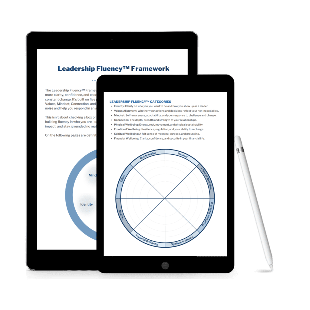 Leadership Fluency™ helps you build the internal infrastructure that makes leading sustainable — not just another set of tactics to manage the chaos. It focuses on Identity, Values, Mindset, Connection, and Wellbeing.
